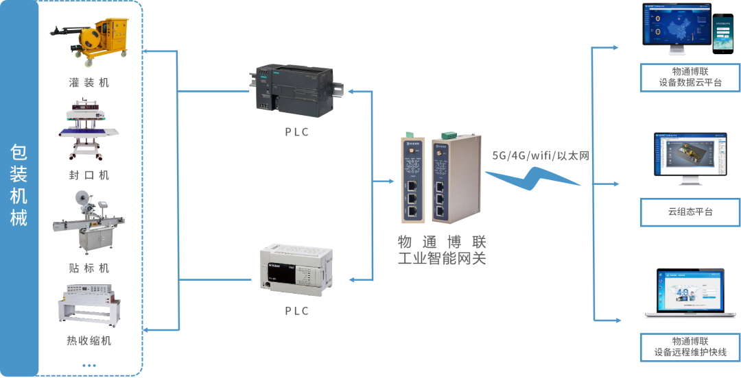 物通博聯工業智能網關具有豐富的通信協議和接口,通過接入包裝機械設備的控制器PLC,就能實時采集包裝機械設備運行狀態、溫度、壓力、振動等參數,通過5G、4G、WIFI、以太網等方式將數據上傳到云平臺,實現遠程監控、組態監控、設備管理、故障報警、遠程控制、遠程維護、數據分析等功能,全面掌握設備的運行情況,幫助企業提升包裝機械設備運維與管理水平,保障安全穩定生產,提高生產效率。當設備出現異常故障就會及時通知管理人員,工程師可以通過物通博聯設備維護快線對設備進行遠程故障診斷與遠程維護,減少設備停機時間,有效提高設備運維效率并降低運維成本。