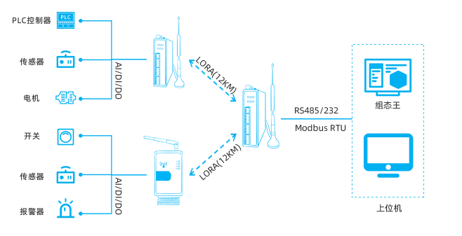 物通博聯·WD系列工業數采終端,主要實現對現場工業設備的數字量DI、DO,模擬量AI,AO的采集和控制,實現LORA本地組網和4G數據上云的功能,從而實現對現場傳感器、執行機構、指示燈等數采和控制。